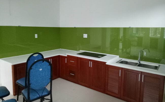 – Khi sử dụng kính cường lực sơn màu để ốp bếp sẽ giúp cho không gian tươi mới, sạch sẽ, cảm giác rộng rãi, bền đẹp với thời gian.