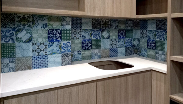 Tường bếp có hoa văn thuộc dòng sản phẩm kính có các hoa văn họa tiết với màu sắc đa dạng