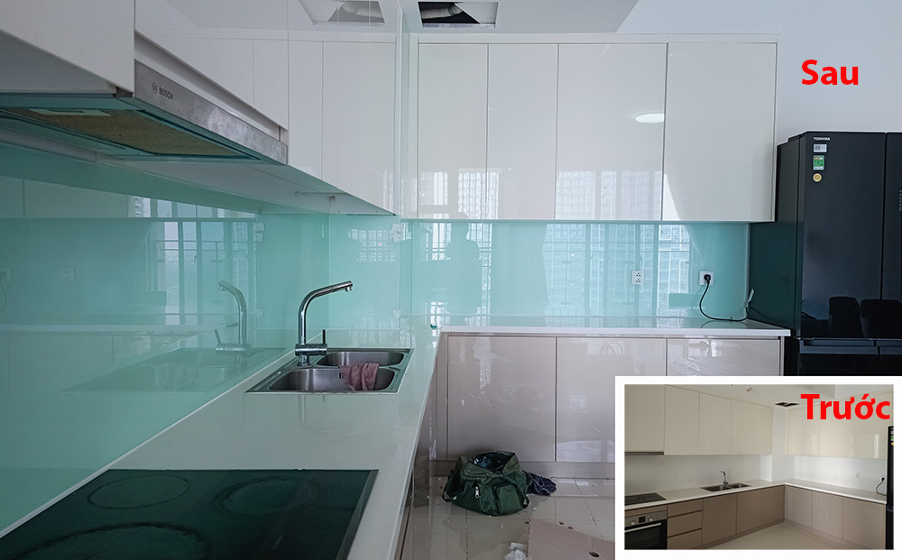 Hình ảnh so sánh tính thẩm mỹ của không gian bếp trước và sau khi lắp kính ốp bếp